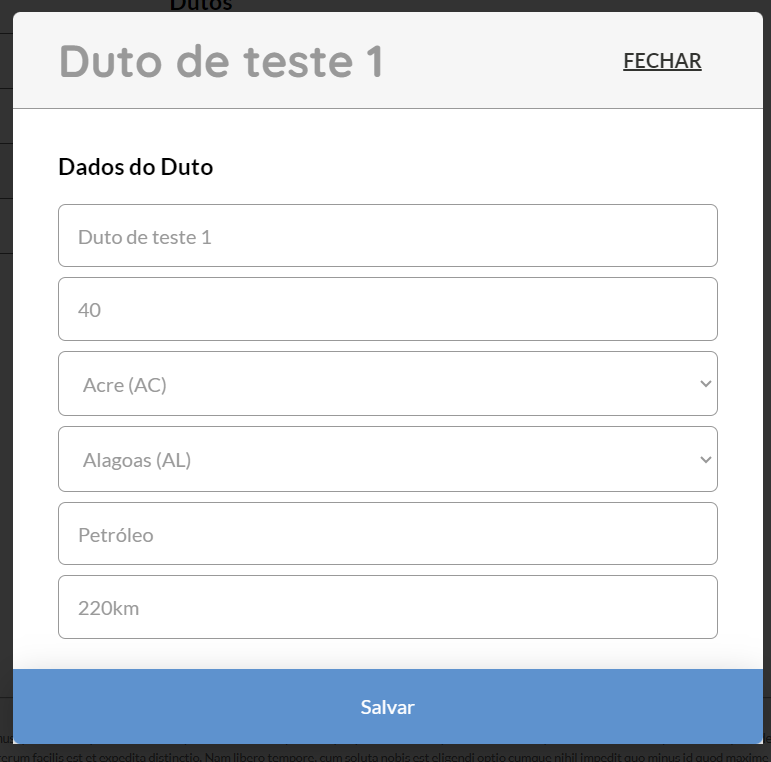 5. As informações cadastradas serão exibidas nos cards e informações internas do duto.